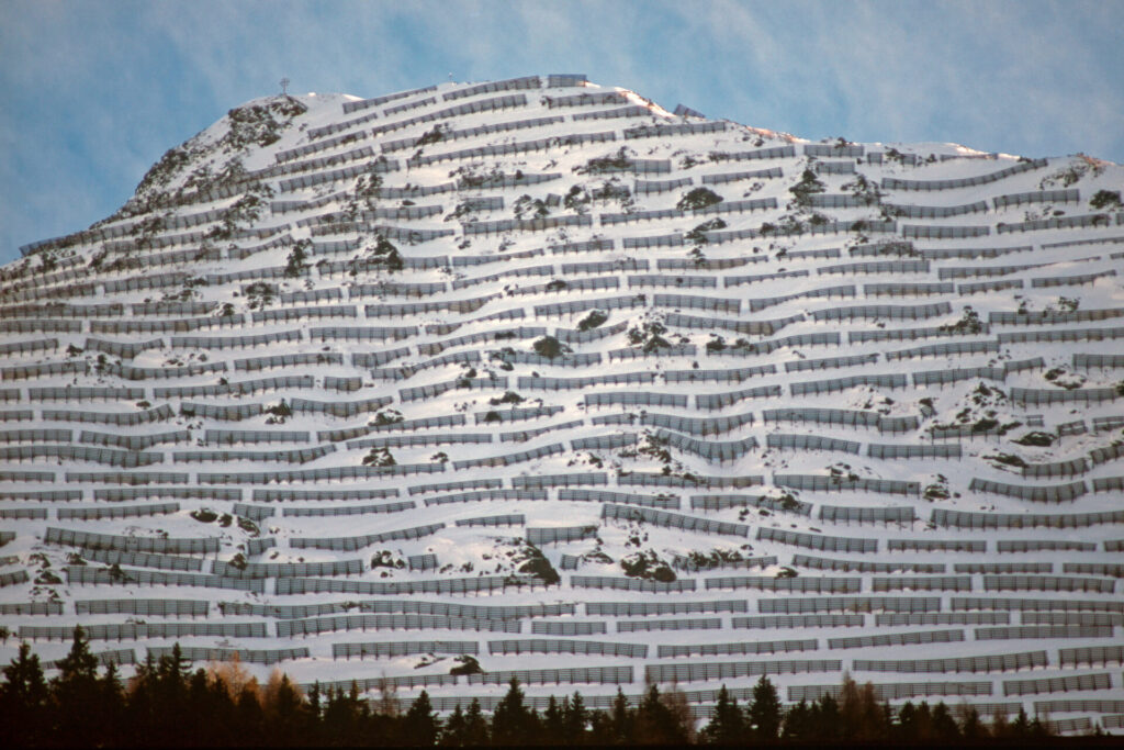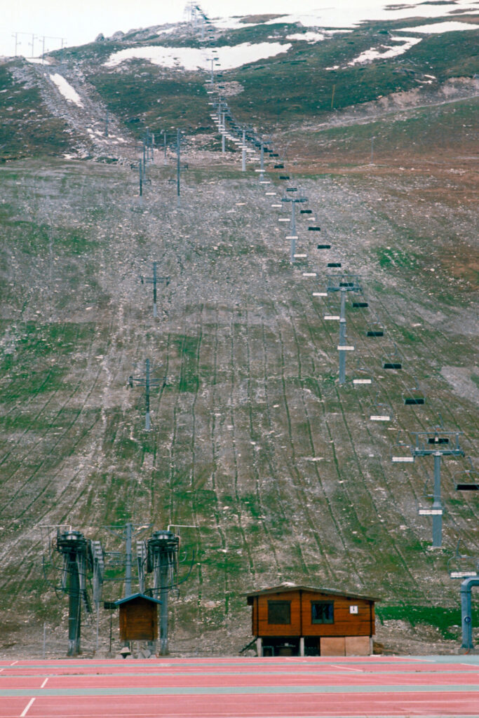 Die Fotos thematisieren die Gratwanderung zwischen Alpenmythos und Alpenwirklichkeit: Wildnis und Kulturlandschaft, Bergeinsamkeit und Industriezivilisation, Kult und Kommerz, Verstädterung und Entsiedelung.
